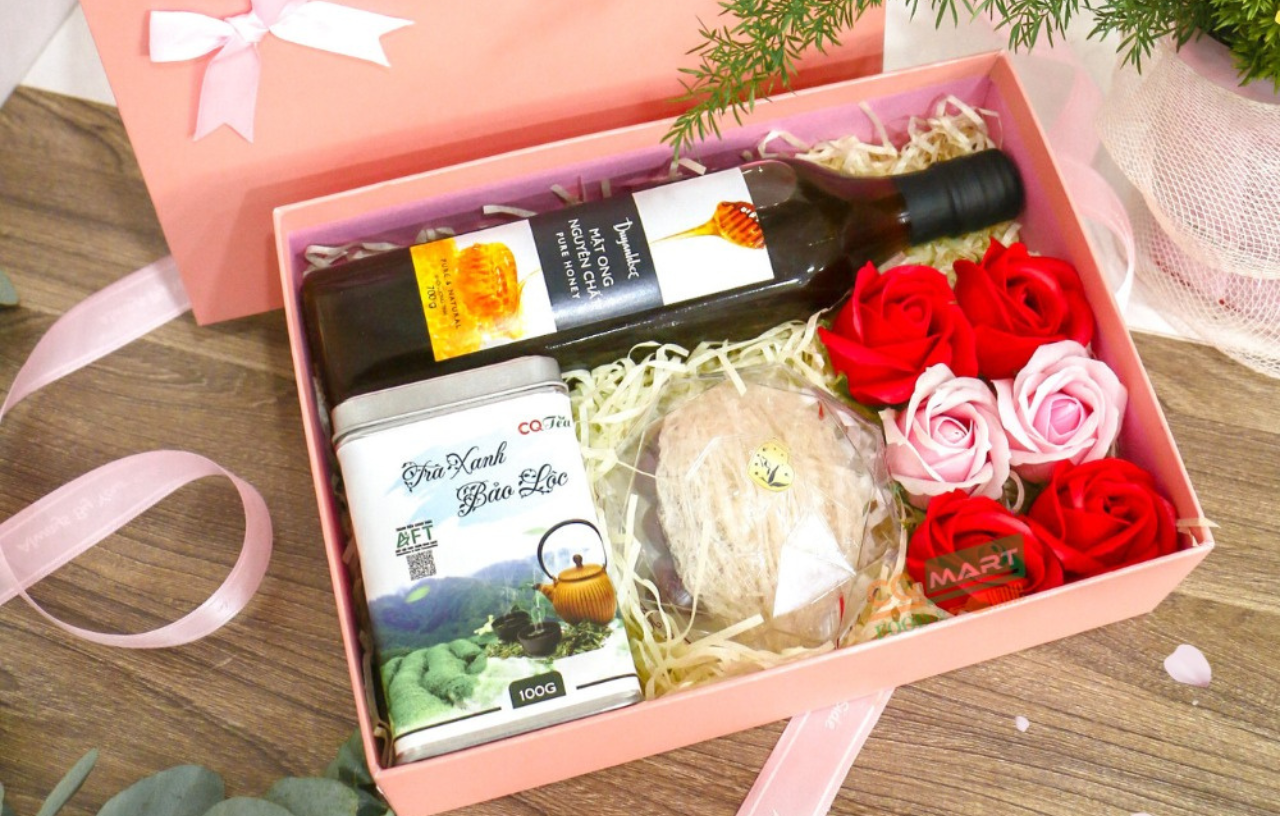 Hộp quà tặng 8-3 My Beloved MS2306 bao gồm: - Mật ong nguyên chất Duy Anh Bee 700g- Trà xanh CQ Tea 100g- Yến sào Thiên Ân Phát 10g- Hộp quà hồng dây xách kèm hoa và phụ kiện. Với đa dạng sản phẩm trái cây tươi, nước ép, socola, hạt, bánh kẹo nội ngoại nhập các loại,... CQ Mart luôn sẵn sàng tư vấn và set-up phần quà phù hợp với yêu cầu và ngân sách của bạn.Thêm hoàn thiện phần quà với hoa tươi/hoa sáp, phụ kiện xinh xắn và còn gì hơn một tấm thiệp với những lời yêu thương do chính tay bạn viết vào.