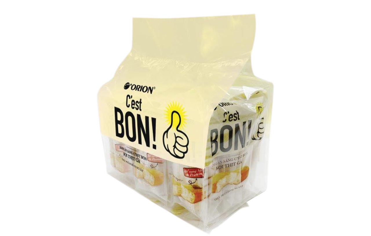 - Bánh Ăn Sáng Sợi Thịt Gà C'est Bon Orion Gói 85g có thành phần chính: Trứng (25%), bột mì, đường, dầu thực vật, chà bông gà (ruốc thịt gà) 5.1% - thịt ức gà tươi, đường, chất điều vị (621, 627, 631) nước mắm, nước tương, muối i-ốt - glucose syrup, chất nhũ hoá, bột lòng trắng trứng, cồn thực phẩm, chất giữ ẩm, isomalto oligo syrup, chất ổn định, muối i-ốt, bột chiết xuất nấm men, bơ, hương tổng hợp, chất tạo xốp, chất điều chỉnh độ acid, sắt, chất chống đông vón, chất mang.