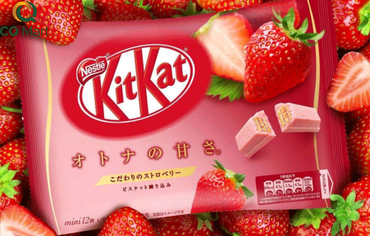 - Bánh Kitkat Dâu Tây nhãn hiệu bánh xốp dinh dưỡng với nhiều hương vị như so-co-la, trà xanh vô cùng quyến rũ nổi tiếng của tập đoàn thực phẩm lâu đời hàng đầu thế giới Nestle. Một gói gồm 12 bánh được gói trong từng túi nhỏ, dễ dàng cho bạn sử dụng.