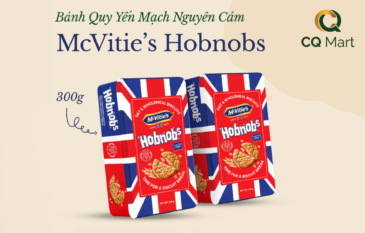 Bánh quy yến mạch nguyên cám McVitie’s Hobnobs 300g là loại bánh quy yến mạch nguyên cám truyền thống. Bánh McVitie's có vị ngọt dịu, tan ngay trong miệng. Mùi thơm của lúa mì rất đặc trưng, bánh hình tròn, giòn rụm… Logo Mc Vitie’s dập nổi trên bánh rất sang trọng. Thích hợp sử dụng như món ăn vặt hàng ngày trong giờ xế sáng/chiều ; không gây ngấy, ngán vì ko có vị bơ nồng.