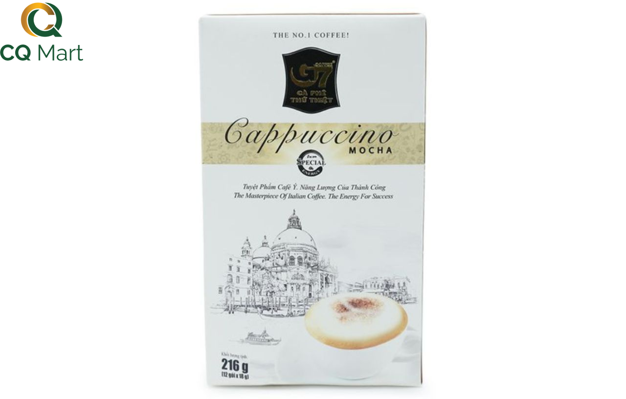 - Duy nhất chỉ có ở Trung Nguyên đã cho ra đời sản phẩm cà phê hòa tan Cappuccino mang phong cách Ý. Với cà phê G7 Cappuccino – tiên phong trong công nghệ, Trung Nguyên đã tạo ra được cà phê hòa tan Cappuccino tuyệt hảo.- Cà phê cappuccino Mocha giúp những người yêu thích cà phê không cần đến quán vẫn có thể thưởng thức một ly cà phê thơm ngon, nhẹ nhàng, tinh tế với mùi thơm của cà phê, vị hấp dẫn của sữa và ngọt ngào của kem, kết hợp với lớp bọt quyến rũ trên bề mặt mang nét đặc trưng của cà phê Ý.