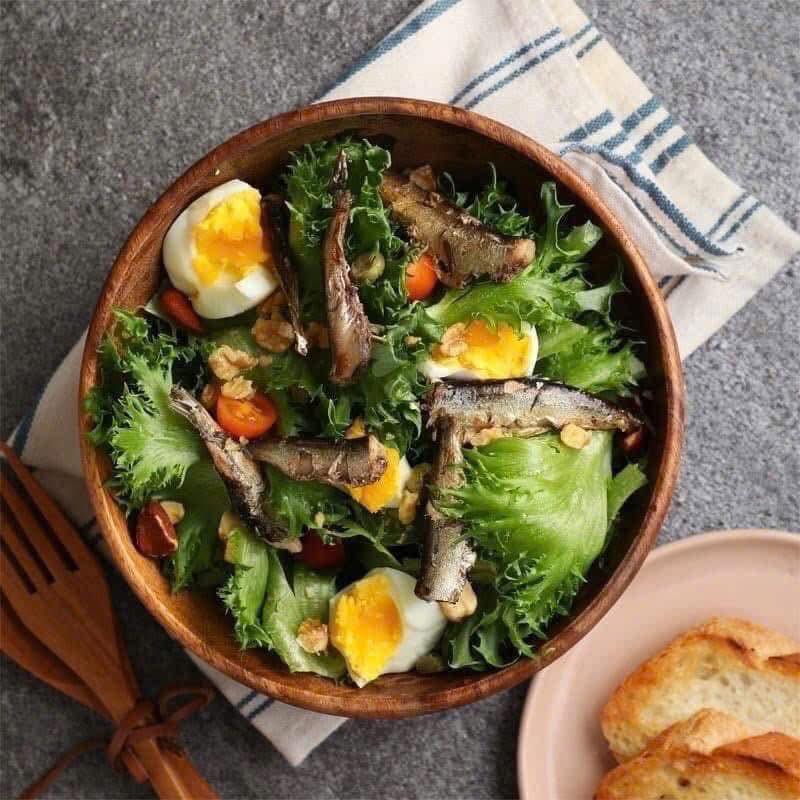 Salad cá trích dầu: Trộn cùng xà lách, cà chua, dưa leo và sốt chanh.