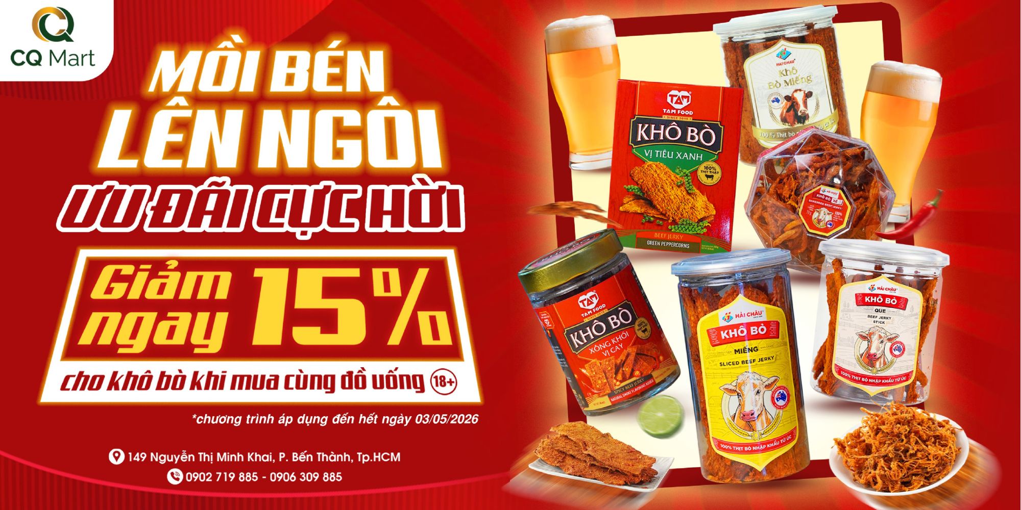 Nếu bạn đang tìm một món nhắm vừa tiện, vừa “bắt vị”, thì khô bò vẫn là lựa chọn số 1. Trong dịp lễ này, CQ Mart áp dụng ưu đãi giảm ngay 15% cho các dòng khô bò Hải Châu và TAMFOOD khi mua kèm đồ uống có cồn.
