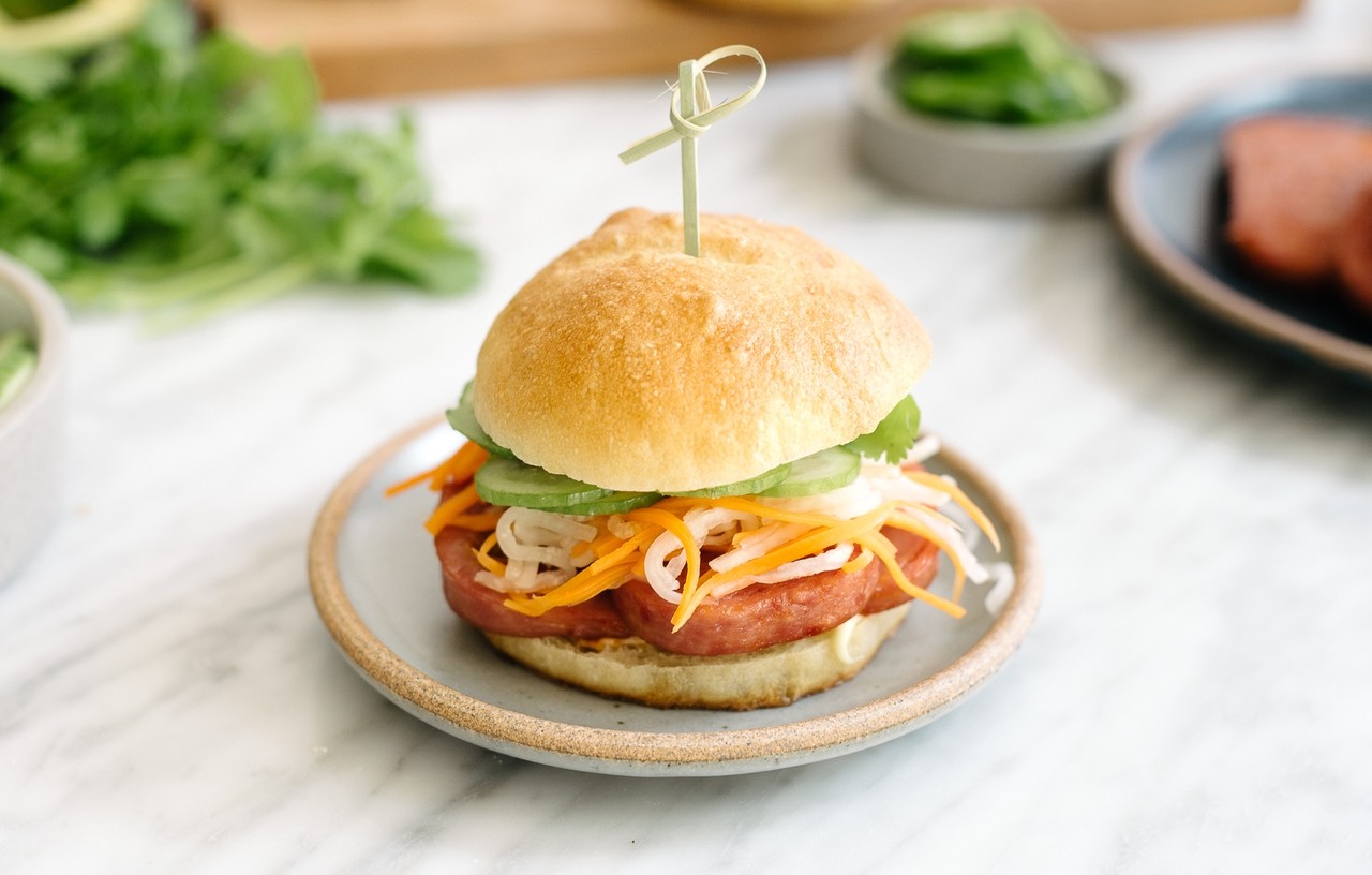Sandwich Spam – Kẹp cùng rau củ và sốt mayonnaise, bữa sáng tiện lợi.